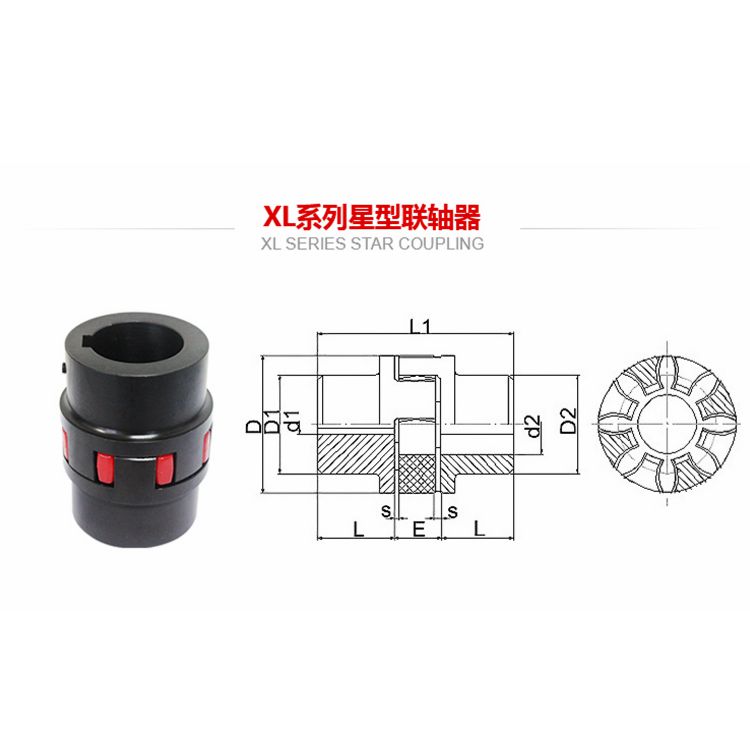 1.XL型星型弹性联轴器的聚氨酯弹性体由凸形爪块限制,可避免由于冲击产生的内部变形及离心力产生的外部变形。